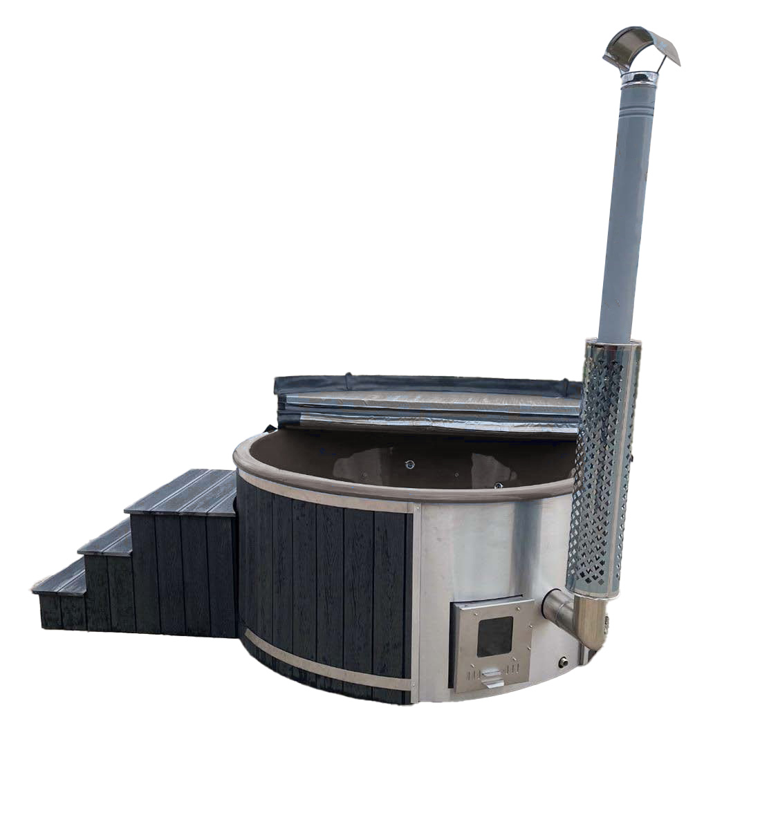 Fiberglass insertFiberglass coverChimneyWood board finishSpruce sidingsSpruce MIDI stairsIntegrated 34 kW stove, AISI 3042 pcs stainless steel strapsWater drainWood color selectionShell color selection