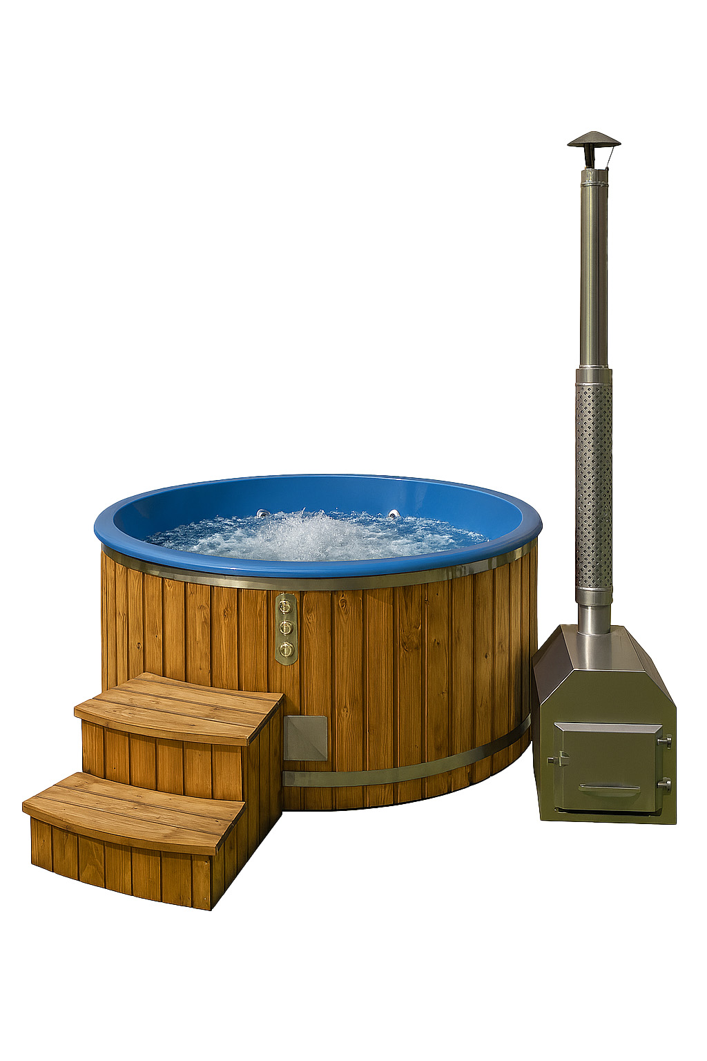Fiberglass insertFiberglass coverChimneyWood board finishSpruce sidingsSpruce MIDI stairsExternal 24 kW stove, AISI 3042 pcs stainless steel strapsWater drainWood color selectionShell color selection